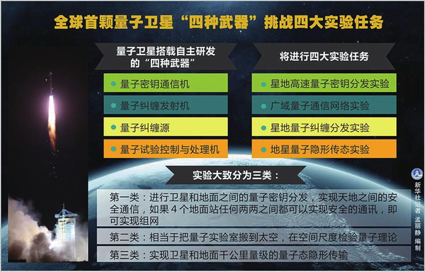 8月16日1时40分,世界首颗量子科学实验卫星“墨子号”成功在酒泉卫星发射中心发射升空。我国成为世界上首次实现卫星和地面之间量子通信的国家,这标志着我国在量子通信领域走到了世界前沿。作为世界首颗量子科学实验卫星,发射升空之后将会进行量子通信实验。未来在轨运行的两年时间里,它将配合地面的五个台站,进行大量工作,并将帮助我们建立一个极其安全的全球通信网络。 中国空间量子卫星领军人物,中国科学技术大学常务副校长潘建伟院士说,之所以起名墨子,因为墨... [详细]