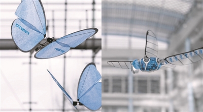 不少无人机研究都从动物身上获得启发,除了模仿雀鸟飞行,昆虫也是灵感来源。德国仿生科技公司费斯托研发出蝴蝶、蜻蜓等扑翼无人机,采用超轻飞行物料,可随心所欲向任何方向飞行、滑翔和定点悬停,展现蜻蜓复杂的飞行特性,飞行动作细腻而优雅。这种无人机结构紧密,小小机身装有感应器、执行元件和传动装置等部件,通过遥控四个翅膀的“仿生蜻蜓”,就可以实现无线实时通讯、持续数据交流、各种感应器评估等各种功能。