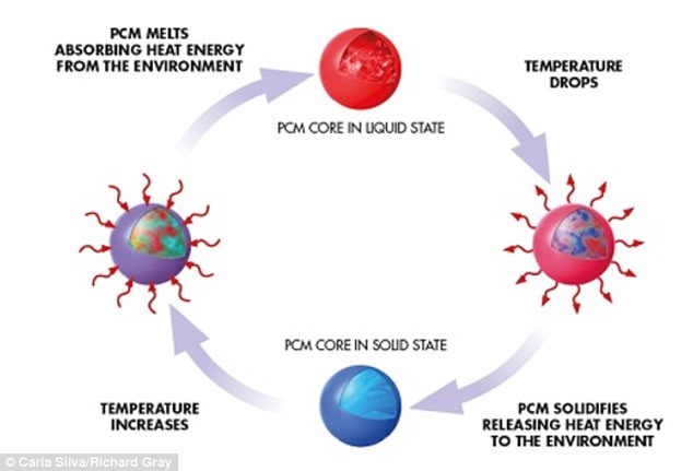 胶囊的蜡状物质在比体温更热的环境下会融化,然后吸收热量;遇冷时则会凝固并释出热量。