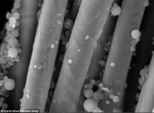 显微镜下可见纳米胶囊依附在服装纤维上。