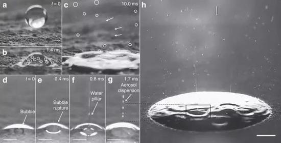 水滴撞击多孔表面形成气溶胶的过程。(a。雨滴以2m/s的速度撞击土壤表面;b。雨滴落下接触到地面时,会把地里的气体包裹住,产生各种小气泡;c。就像打开一瓶被摇过的雪碧,气体扑面而来的感觉,水滴撞击后喷射出细小的 “水滴”四溅开来; d-f是高速摄像机捕捉的气溶胶形成的过程。)