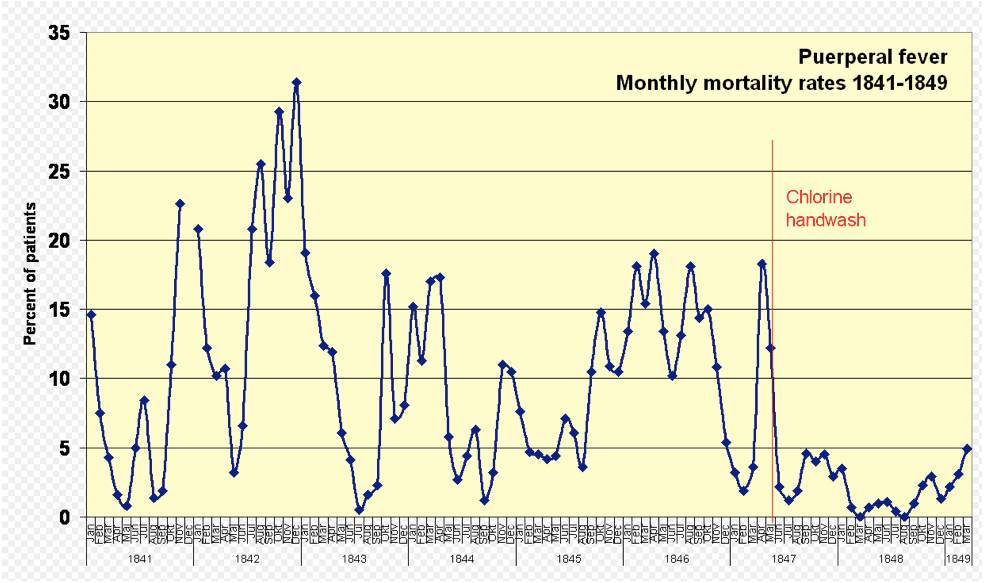 就是这一项简单的工作,奥地利总医院产褥热的死亡比例持续下降,从1847年4月的18.3%,降到了6月的2.2%,七月的1.2%,八月的1.9%,并在后面有两个月降到了零。