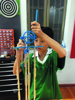 把塑料水管的一段切出斜面并钻出一个比钻头大的洞,在水管的另外一端套上气球,简单又实用的“简易电钻吸尘伴侣”就诞生了。在使用电钻时只要把钻头穿过小洞,钻墙时纷纷扬扬的灰尘就会通过水管收集到气球里面。“我是在家里装修时,看到爸爸把我的房间弄了很多灰尘时想到的。”番禺区钟村中心小学的冯文捷向记者介绍了发明的初衷。