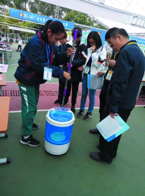 “只要这样提起来、按下去,洗衣桶就会转动,就像普通的洗衣机一样。日常我们在宿舍不用通电也可以使用。”广东实验中学附属天河学校高二学生张洁一边解说一边向围观的市民展示自己的发明。